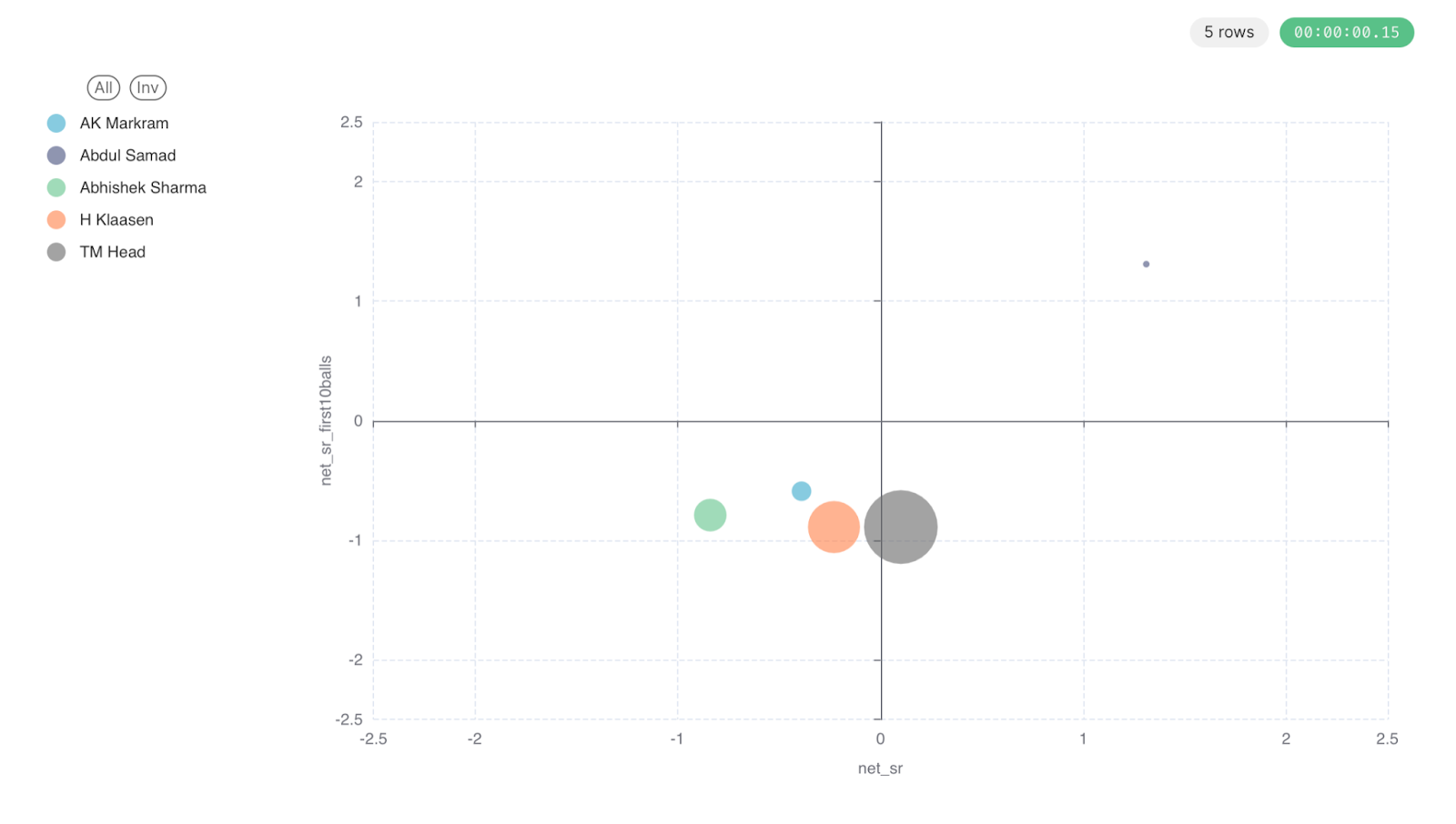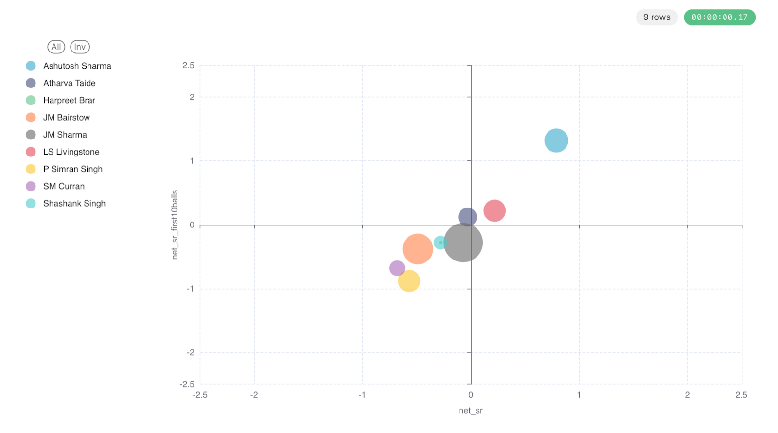 First thing to note is the size of the bubble. In both the innings, there is one big bubble clubbed with smaller ones. This tells us that the innings was largely driven by a single player in both the innings. It was Stoinis vs Ruturaj head to head. The other smaller bubbles cancel each other out. So, whoever between the two scored more quickly ended up on the winning side. This basically says that the more balls you play, the more important it becomes to score quicker. In this case, Stoinis was a tad-bit quicker than Ruturaj.
