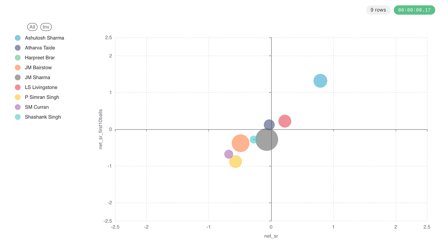 In this match, only 147 runs were scored and yet there are 2 batters with positive net_sr in the first innings - Ashutosh Sharma and Liam Livingstone. Though this score was chased successfully, it took 19.5 overs for that.