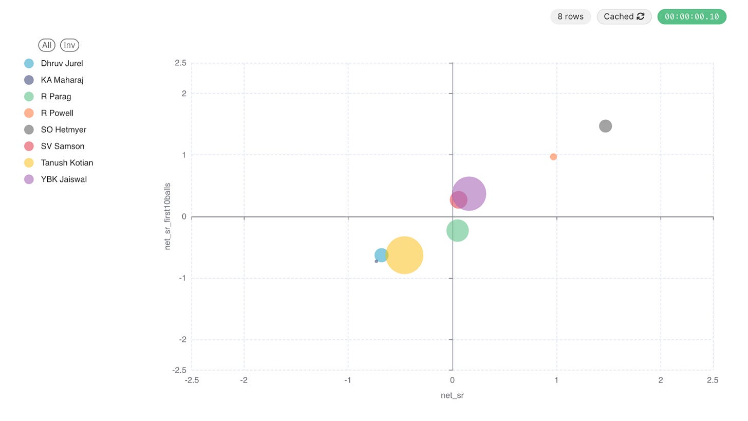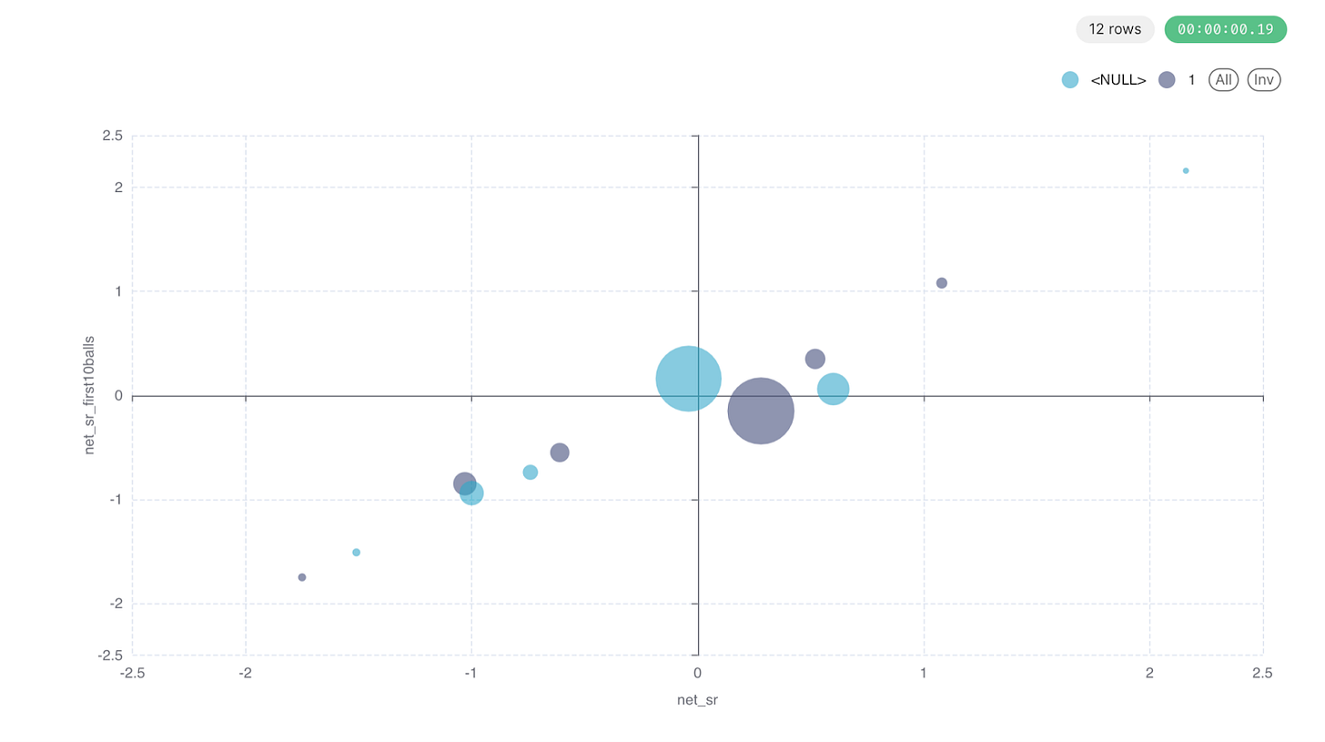 Which brings me to the next thing one needs to notice on the map - the position of the bubble. The Stoinis bubble is below the x-axis which means he started slow and above the y-axis which means by the end of the innings he caught up. If we look at the Ruturaj bubble, it is slightly above the x-axis which means he started quick but he is slightly to the left of the y-axis which means he ended at less than the required runs per ball and we all know that LSG breached the Chepauk fortress in that match.