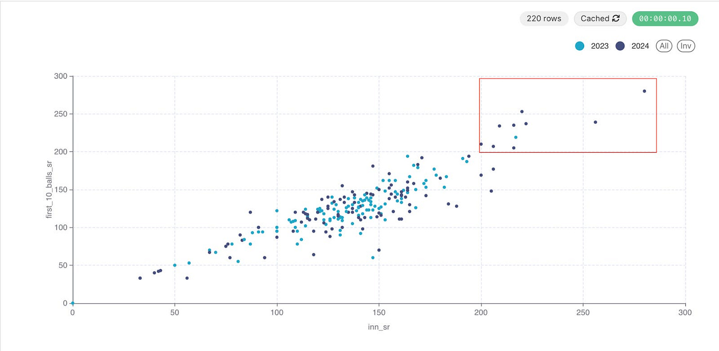 In the last post, I showed you this plot and said that this IPL has seen the rise of many batters that not only score quickly but also start scoring quickly earlier in the innings.