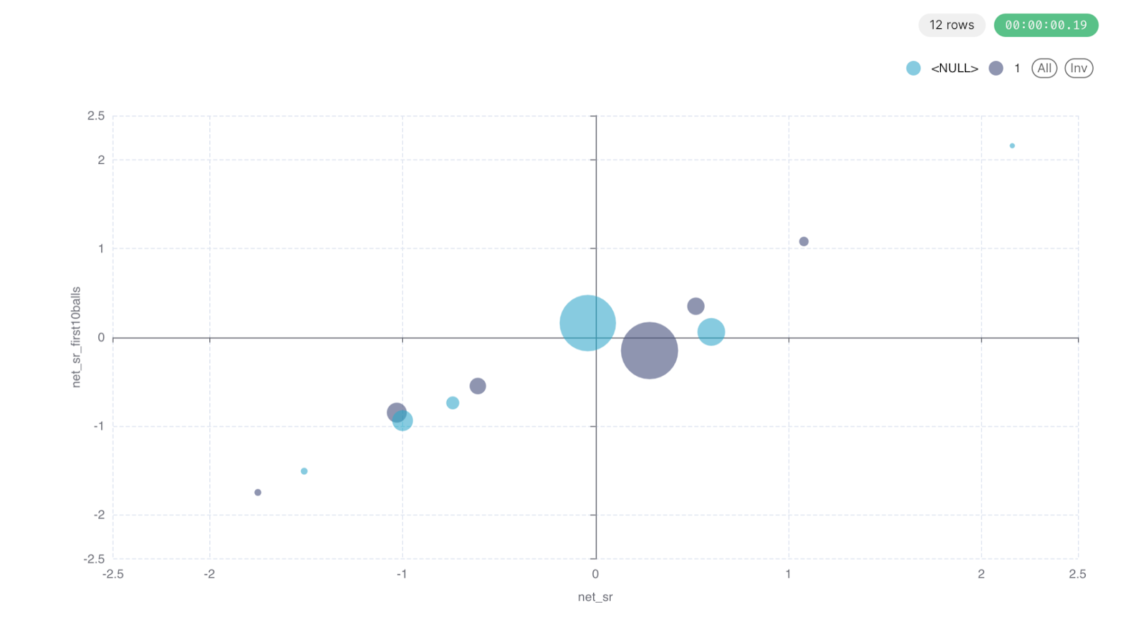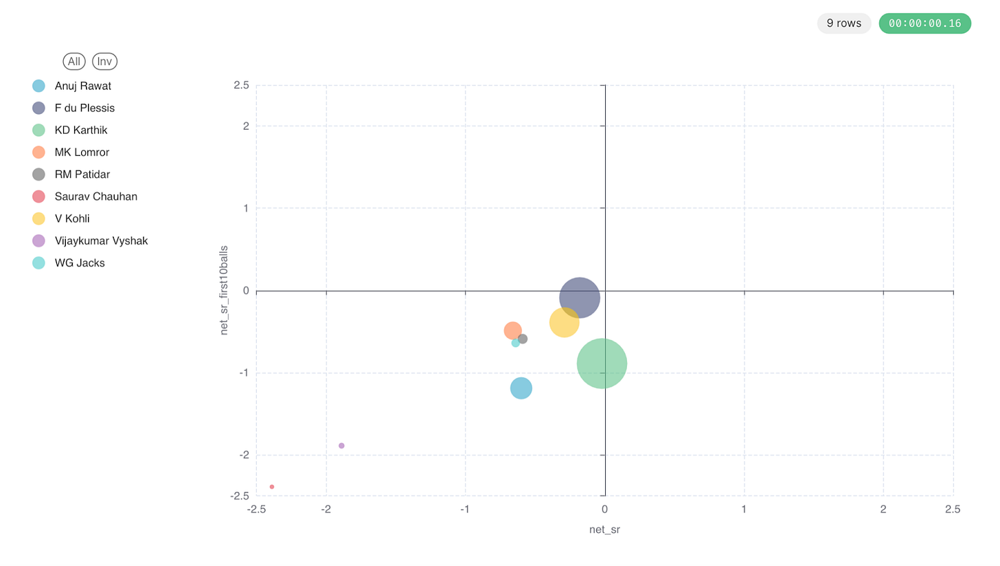 Notice the orange dot, which is Klaasen. He scored 67 runs in 31 balls. In most of the matches his net_sr would be positive but not in this crazy run-show where 287 proved to be just a little bit above the required score. Also, notice the small dot in the top right corner. It is Abdul Samad. His innings of 37 runs in 10 balls proved to be the difference eventually as is evident in the second innings graph below where RCB did not have a hitter who could come and go nuts. This is where the strike rate in the first 10 balls becomes crucial.